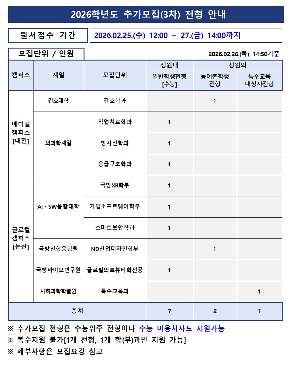 | 제목 | 2026학년도 추가모집(3차) 모집요강 탑재 안내(2026.02.26) 이월반영 8차변동 | ||||