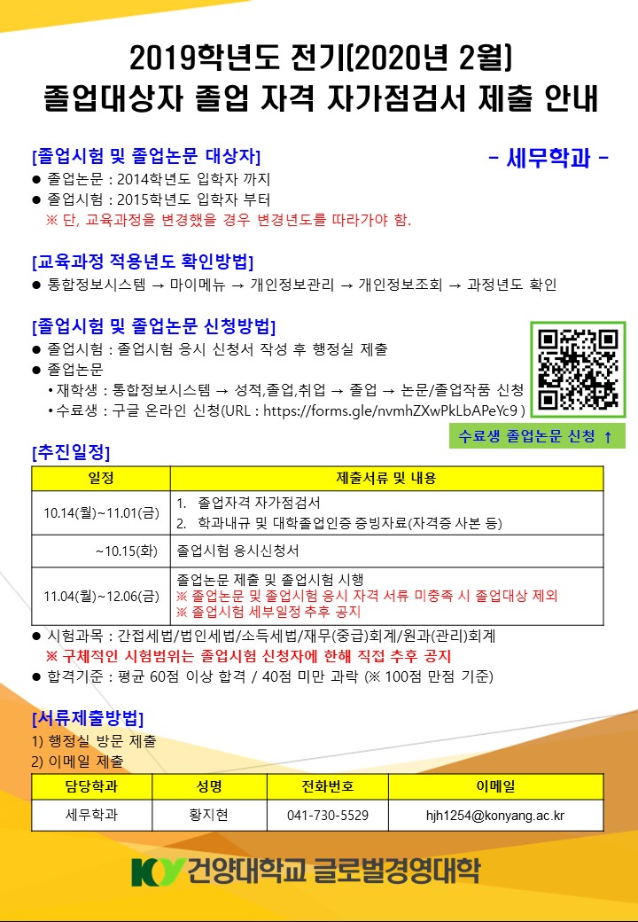 안녕하세요? 2019학년도 전기(2020년 2월) 졸업대상자 세무학과 졸업시험 및 졸업논문 제출 안내드립니다. 졸업시험 및 졸업논문은 학과내규와 대학의 졸업인증을 모두 충족하였을 시 졸업시험 응시 및 졸업논문 제출이 가능함을 안내드리며, 자격 서류 미충족 시 졸업대상에서 제외되오니 각 제출서류는 반드시 기한내에 제출하시기 바랍니다. 졸업논문 제출 대상 중 수료생일 경우 아래의 링크를 통해 신청 바랍니다. ( ☞ URL : https://forms.gle/nvmhZXwPkLbAPeYc9 ) 문의사항이 있으신 분은 아래의 번호로 연락바랍니다. 감사합니다.